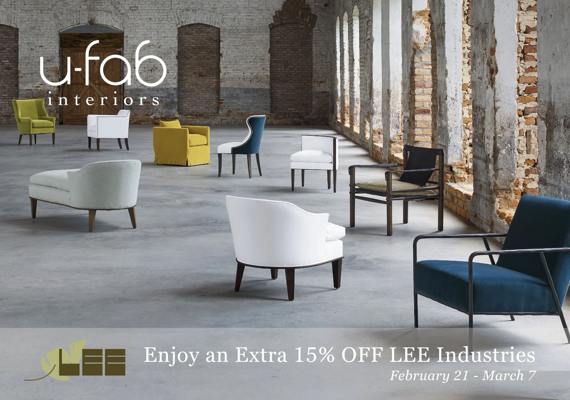 Elevate your living space with iconic upholstery, handcrafted in the USA. From February 21 through March 7, enjoy an extra 15% OFF all custom sofas, sectionals, chairs, ottomans, and beds from LEE Industries, only at U-Fab Interiors.